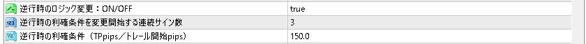 ポジション取得後にレートが逆行し、逆方向のサインが出始めた場合に、通常の利確条件(コツコツ利益を積む設定)ではなく、少し大きめの利確を狙い、含み損の負担を軽減するための機能を追加しました。