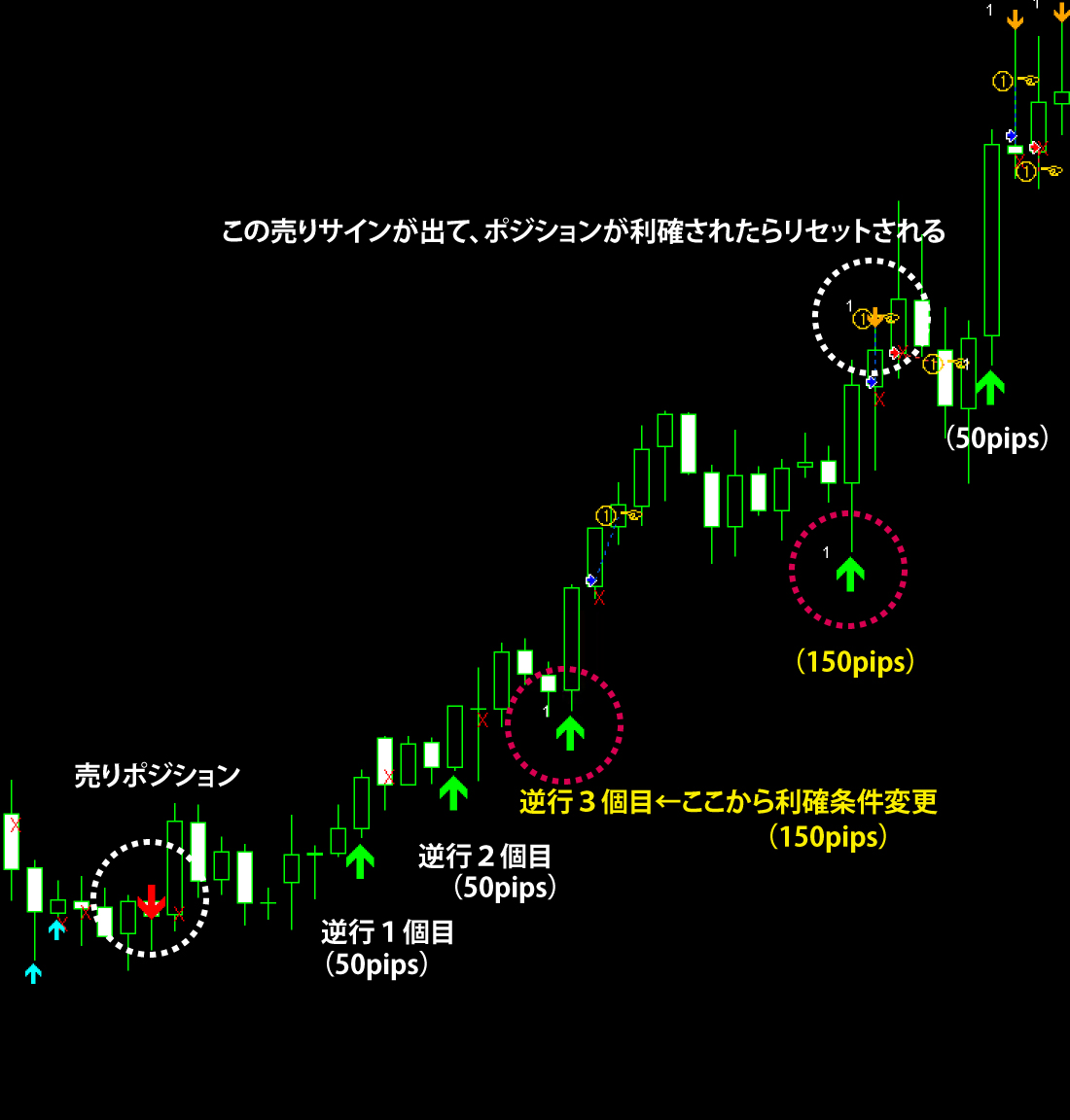 「逆行時の利確条件」を150pipsに設定していた場合、3本目の買いサインで取るポジションは、それまでの50pipsではなく150pipsに利確条件が変更されてエントリーされます。