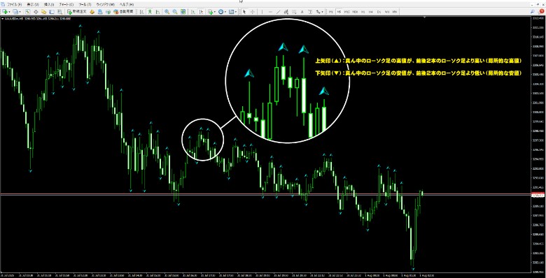 フラクタルとは、チャート上に現れる特徴的なローソク足のパターンで、相場の目立った高値(山)と安値(谷)を自動的に見つけ出し、矢印でマークしてくれるインジケーターです。具体的には、中央の1本のローソク足が、その両隣2本ずつ(合計5本)のローソク足の高値よりも高い場合に「高値のフラクタル(上向き矢印)」が、逆に最も低い場合に「安値のフラクタル(下向き矢印)」が表示されます。