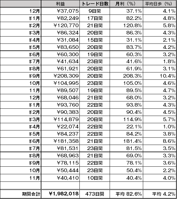 このシステムを2023年12月から運用した実績をご覧ください。左側の表は、3通貨ペアを対象に初期証拠金100万円で運用した実績です。