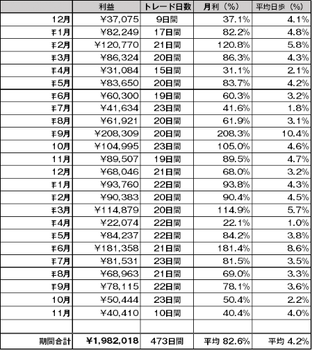 右側の表は、2通貨ペアを対象に、10万円の証拠金で、10%のコピー率で運用した実績となります。