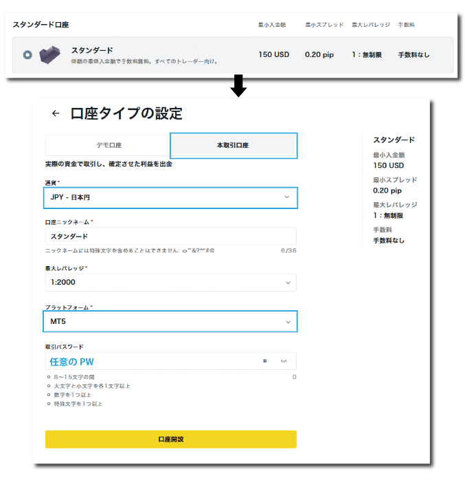 口座が「MT5」の口座、「日本円」であることを必ず確認して下さい。