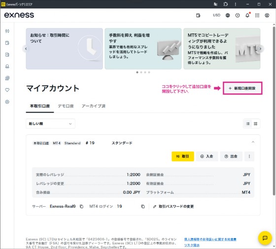 新たに口座を追加されたい方は、Exnessのマイアカウントページの右上にあります「+新規口座開設」ボタンをクリックして、