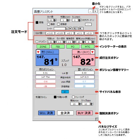 TradingAssistantは、多くのトレーダーが直面する、煩雑なプロセスを解決するために設計されました。注文執行、ポジション管理、多彩な決済戦略、そして高度な相場分析といった、取引に必要なあらゆる機能を一つの洗練されたGUIパネルに集約しています。これにより、MT4標準のターミナルウィンドウや複数のインジケーターをチャートに導入する必要がなくなり、すべての操作と情報が一元管理された環境が実現します。