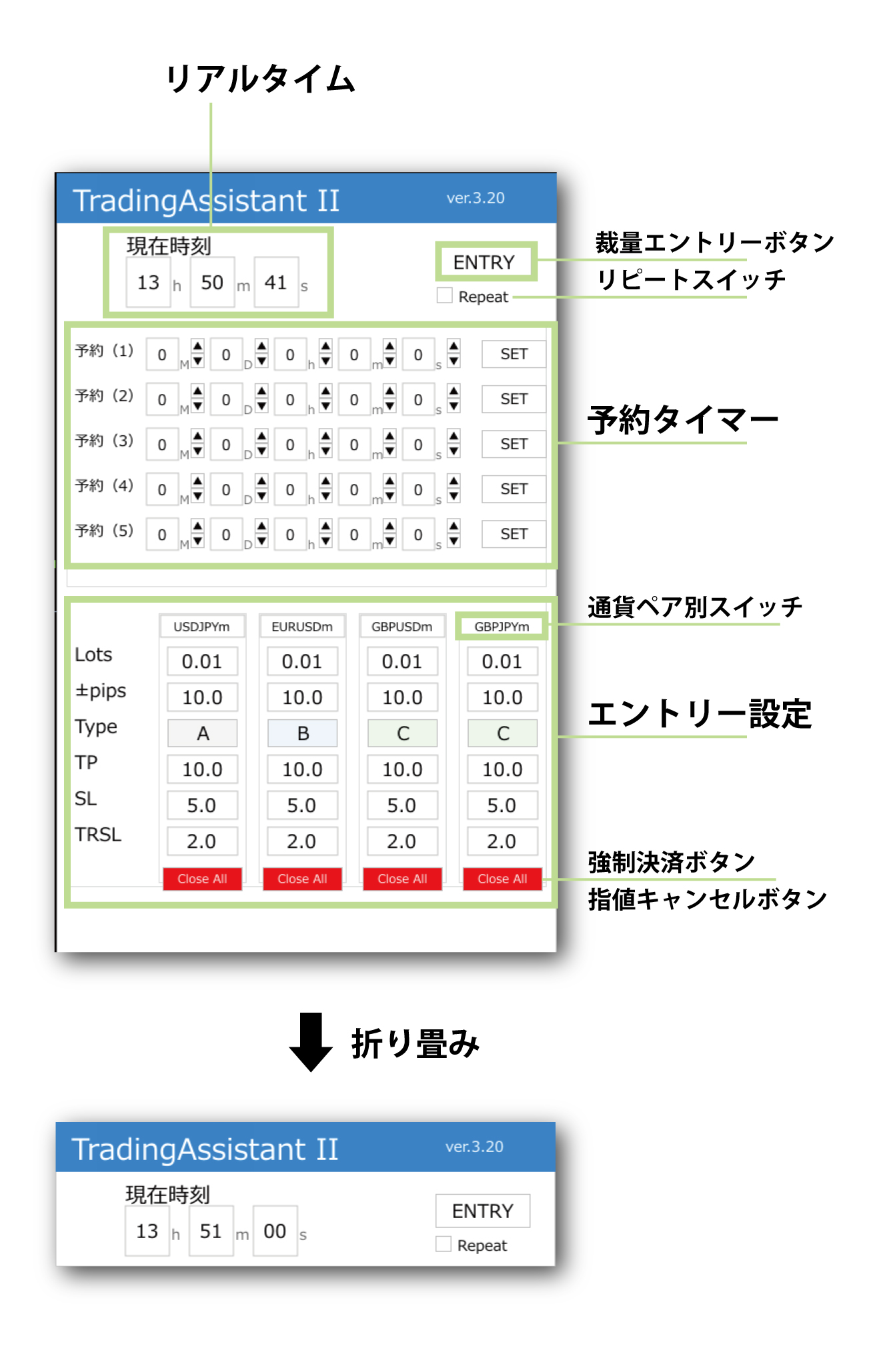 ■ もう、チャートの前で張り付く必要はありません 「重要な指標発表があるけれど、夜中だから起きていられない」「仕事中でチャートが見られない」――そんな理由で大きなチャンスを逃すのは終わりです。 5つまで登録できる「秒単位の予約機能」が、あなたの代わりに24時間体制で市場を監視します。指定した時刻のジャストタイミングで、EAが冷静に罠を仕掛けます。あなたは結果を確認するだけです。