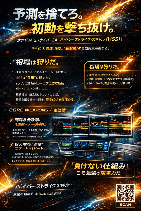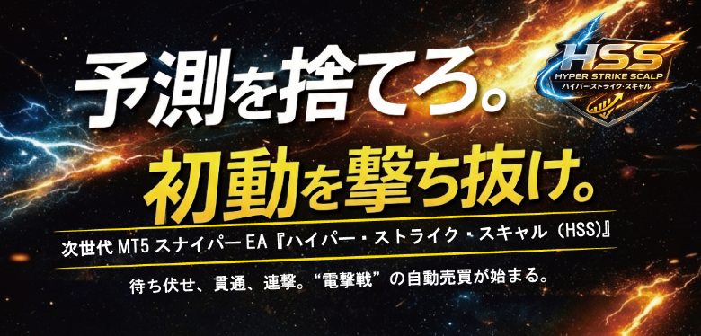HangPong Sep 2026『TradingAssistant II』は、相場が「上がるか下がるか」を予測するのではなく、「大きく動く事実」そのものを利益に変えることを目的とした、トレンド待ち伏せ型のトレード支援ツールです。 雇用統計や政策金利発表といった重要な経済指標時など、価格がどちらかに急激に動くタイミングを狙い、現在の価格の上下に「網」を張るように注文を仕掛けます。そして、相場が動き出した瞬間の初動を確実に捉え、その後のトレンドに追随して利益の最大化を目指します。