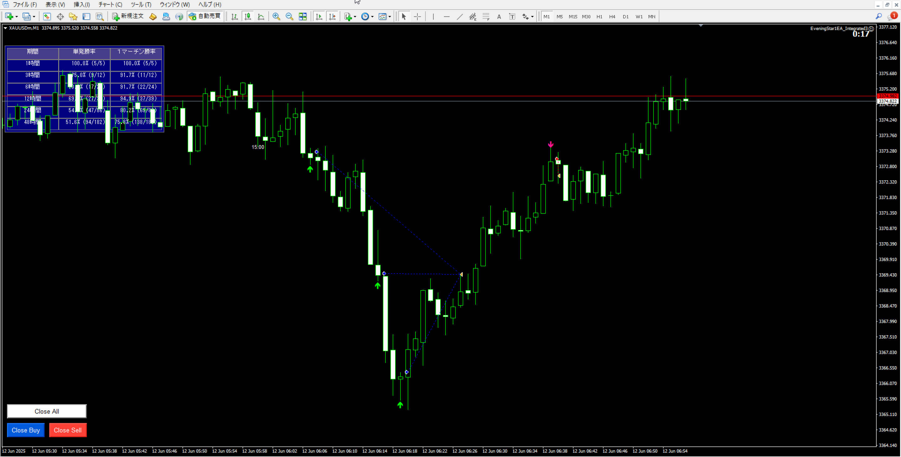これらの要素を複合的に分析し、EA 内部で「買いの条件が整った」または「売りの条件が整った」と判断された場合に、チャート上にサイン(矢印)が表示されたり、FX 自動売買の場合はエントリーが行われたりします。