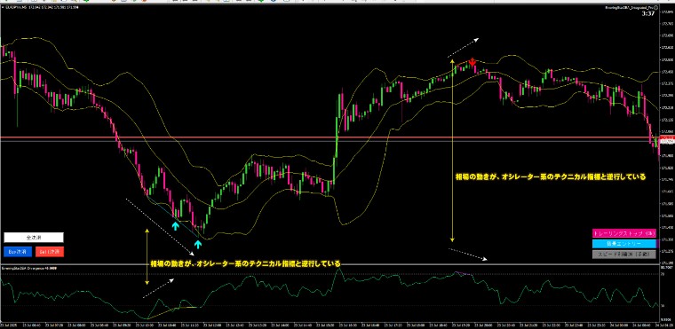 一方、フラクタルは、サインが成立するための条件(5本のローソク足が確定すること)が厳格であるため、シグナルの表示が少し遅れるという特徴があります。しかし、これは欠点ではありません。むしろ、この「遅れ」こそが、サインの信頼性を担保しているのです。 一度フラクタルの矢印が表示されたら、それは「確定した山(谷)」として扱われ、後から消えたり動いたりすることはありません 。本EAは、このリペイントしないフラクタルを基準にすることで、信頼性の高いダイバージェンス分析を実現しています。