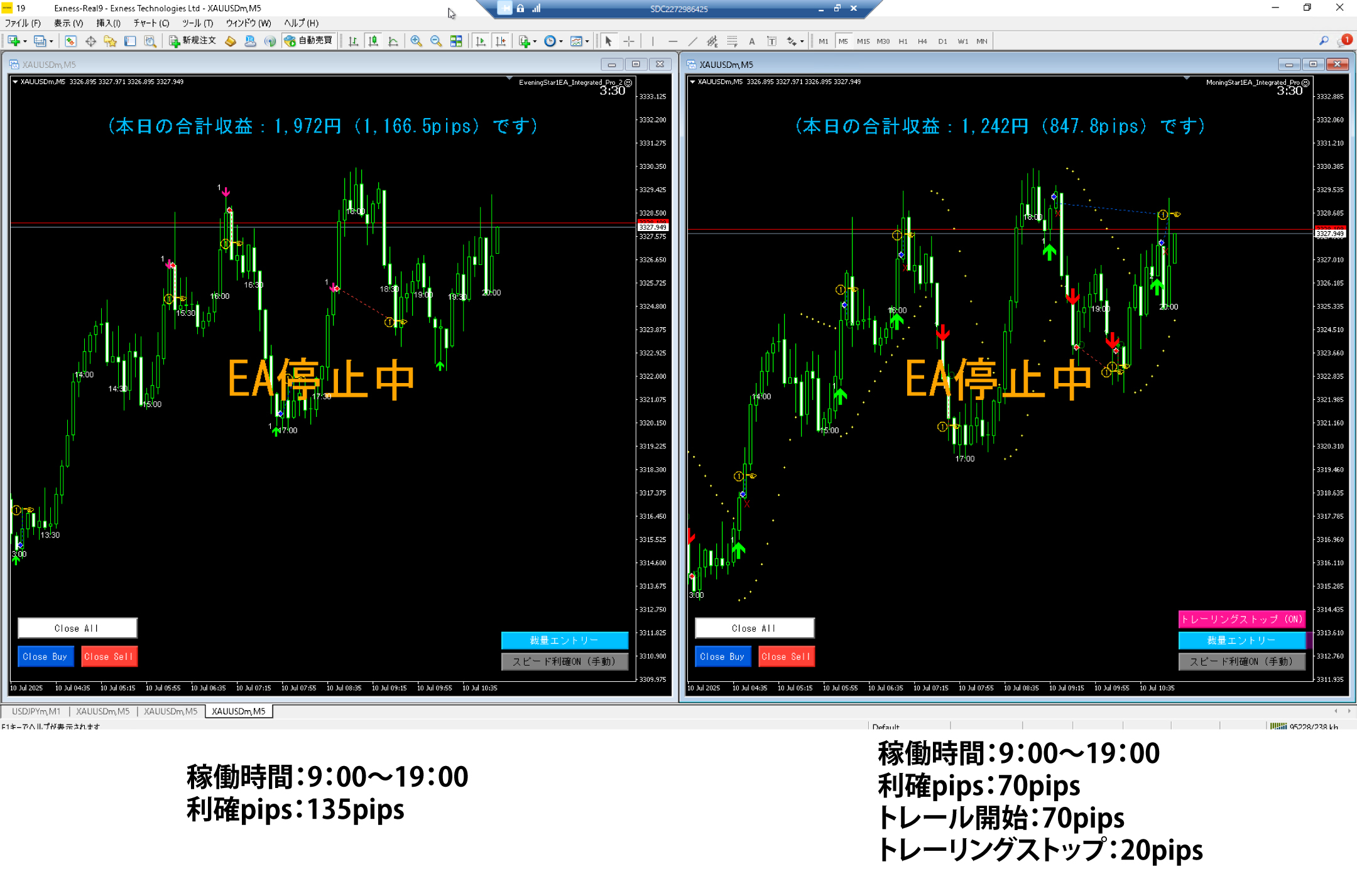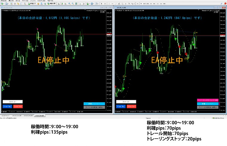 ②FX自動売買(EA)モード: 完全自動のトレーディングシステムとして、このモードでは、EAを5分足チャートに適用します。サインの発生からエントリー、そして利益確定や損切りといった決済まで、全ての取引プロセスをEAが全自動で行います。一度設定すれば、あとはシステムに任せておくだけで、24時間市場のチャンスを狙い続けることが可能です。