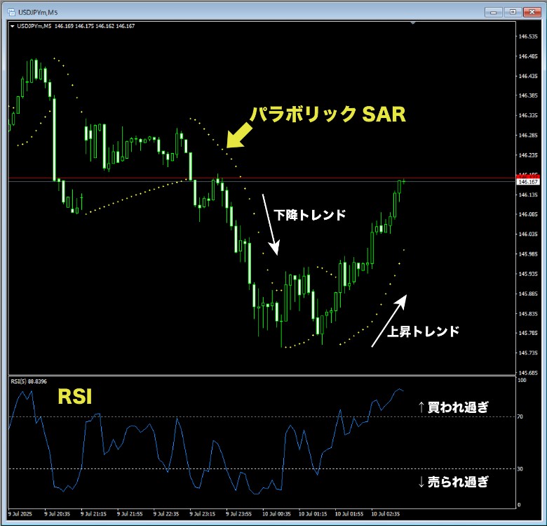 エントリーを判断するロジックの根幹には、「Morning Star SAR」と呼ばれる独自の分析手法が組み込まれています。これは、二つの有名なテクニカル指標(パラボリックSAR/RSI)を組み合わせることで、精度の高いシグナルを生成するものです。これら二つを巧みに組み合わせ、「トレンドの方向に沿って、かつ相場に勢いがついた瞬間」を狙い撃ちします。方向性と勢いの両方を確認することで、より確度の高いエントリーポイントを見つけ出すのが、このEAのロジックの核心です。