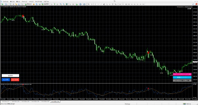 大きなトレンドの方向を確認した上で、次に見るのが具体的なエントリーの「きっかけ(トリガー)」です。このEAでは、相場の勢いや過熱感を示す「RSI」というインジケーターが、RSI自身の動きを滑らかにした「移動平均線(MA)」をクロスした瞬間を狙います。これが、トレンドの方向へエントリーするための主要なサインとなります。