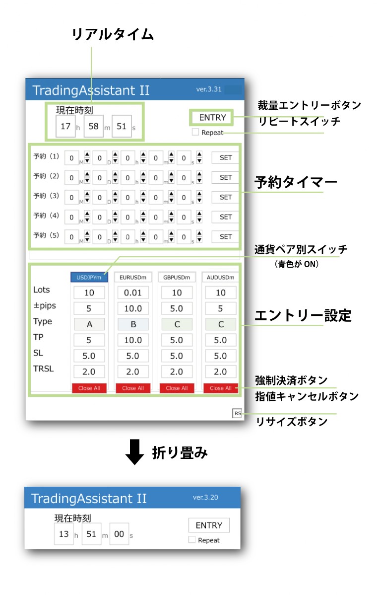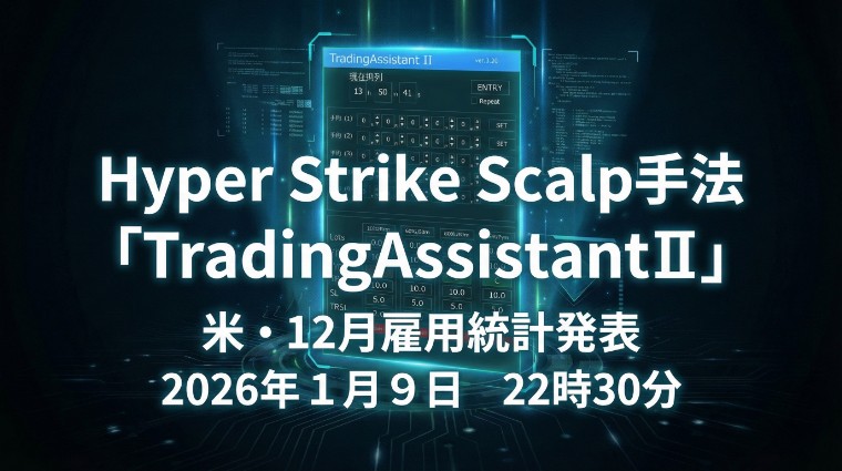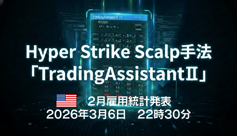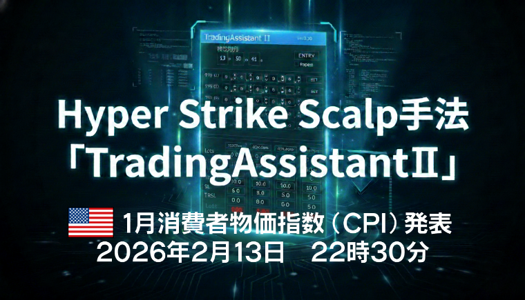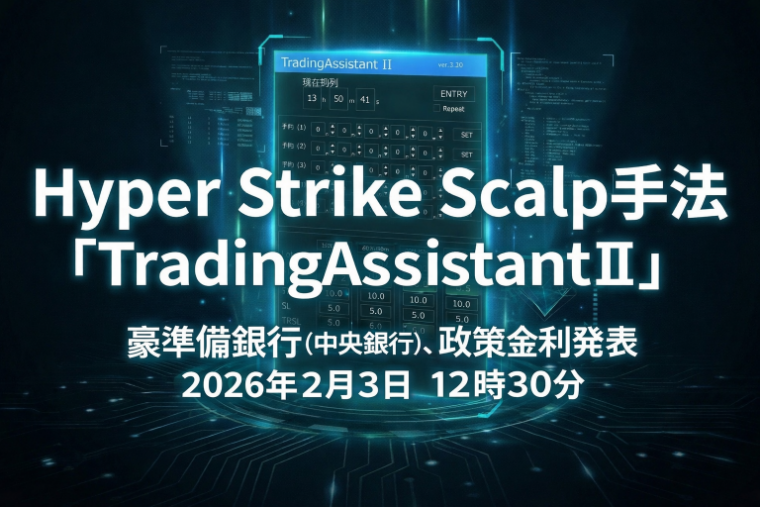 HangPong Sep 2026『TradingAssistant II』は、相場が「上がるか下がるか」を予測するのではなく、「大きく動く事実」そのものを利益に変えることを目的とした、トレンド待ち伏せ型のトレード支援ツールです。 雇用統計や政策金利発表といった重要な経済指標時など、価格がどちらかに急激に動くタイミングを狙い、現在の価格の上下に「網」を張るように注文を仕掛けます。そして、相場が動き出した瞬間の初動を確実に捉え、その後のトレンドに追随して利益の最大化を目指します。