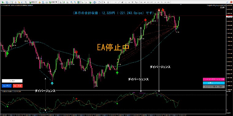 ②EveningStar (宵の明星) のロジック: こちらは対照的に、トレンドの終わり、つまり転換点を捉える「逆張り」を基本戦略とします。価格が上がりすぎたり、下がりすぎたりした後の反転を狙います。そのために、価格の動きとインジケーターの動きが逆行する「ダイバージェンス」という現象を高精度で検知するロジックを搭載しています。